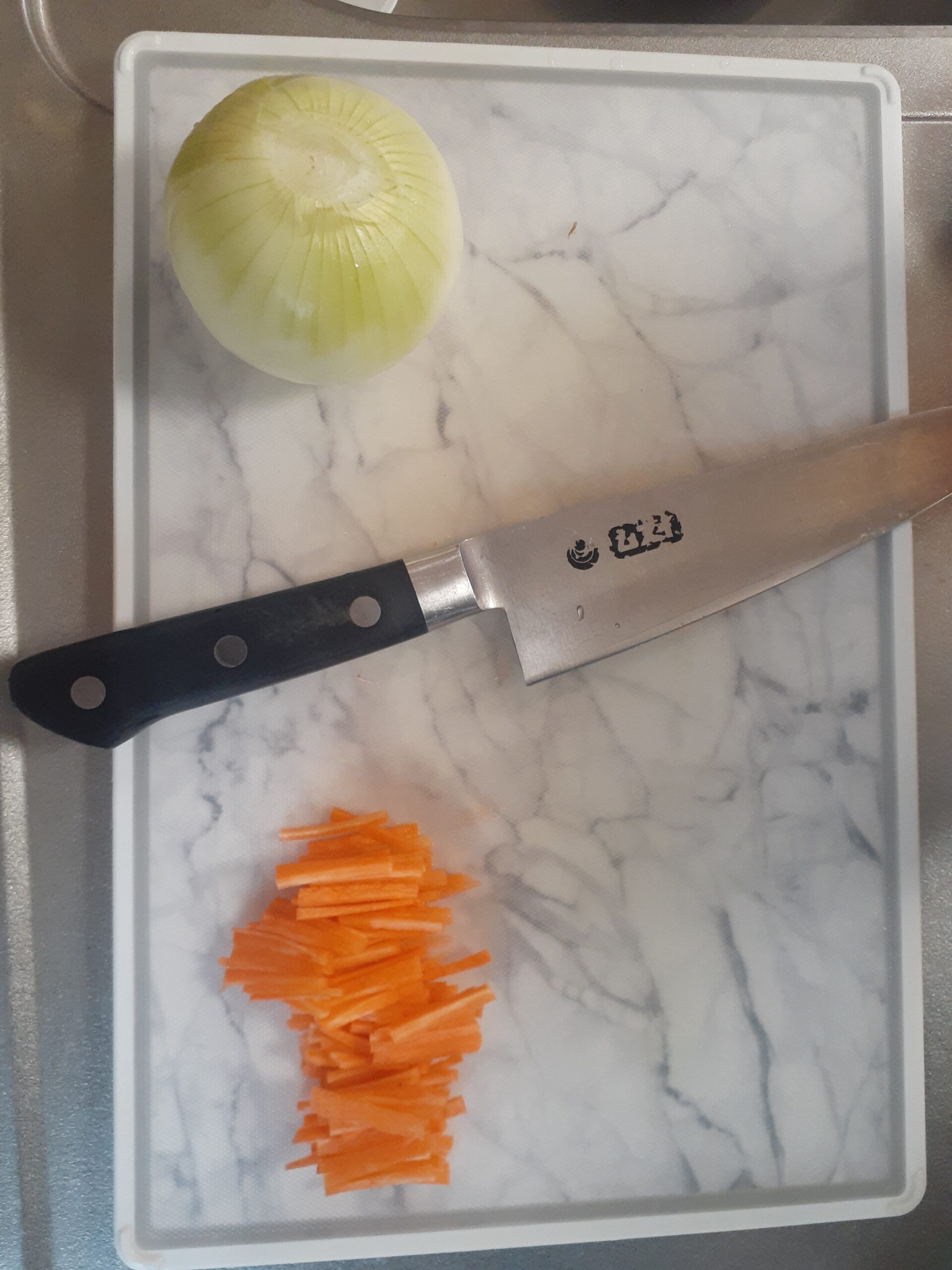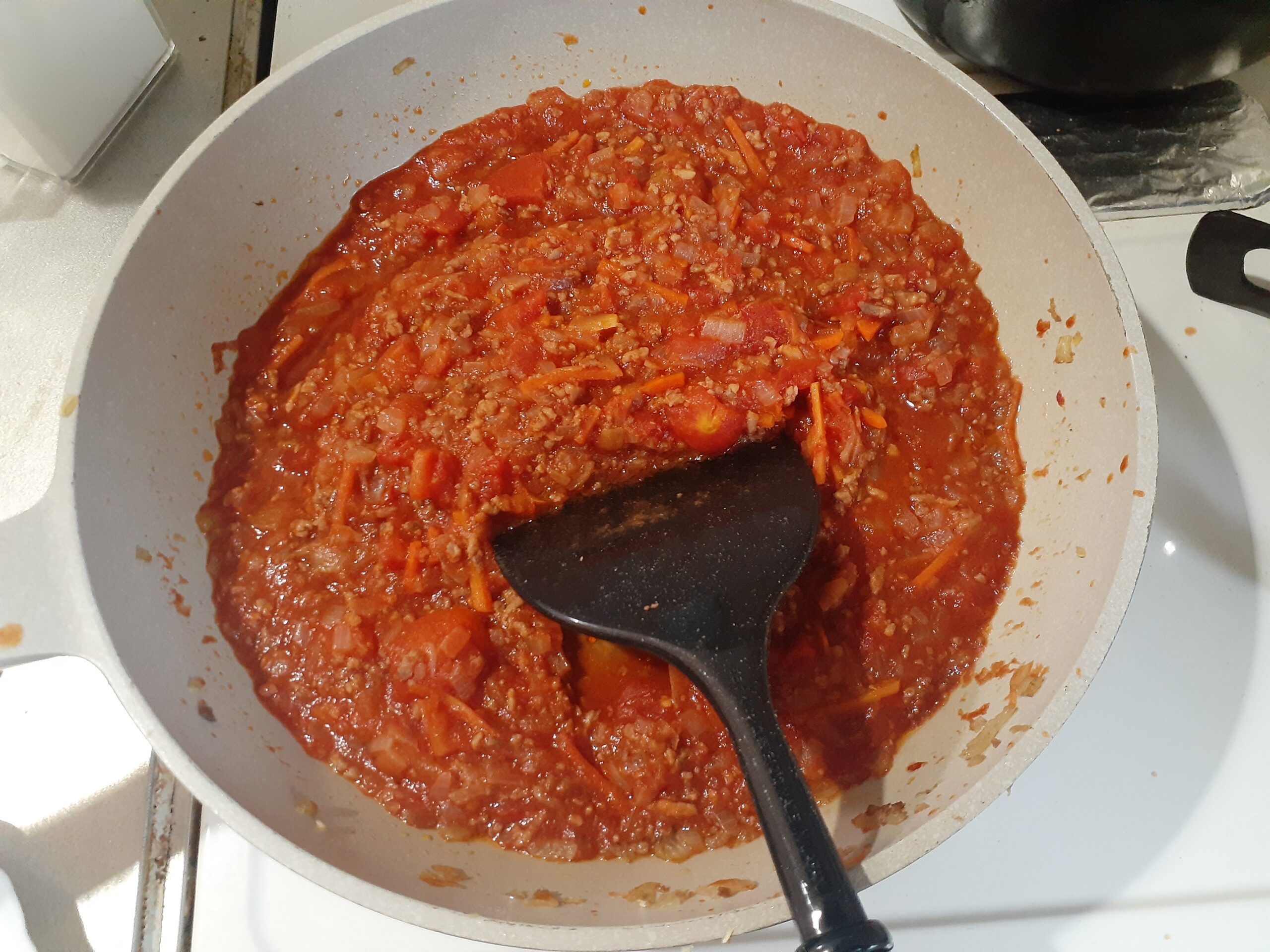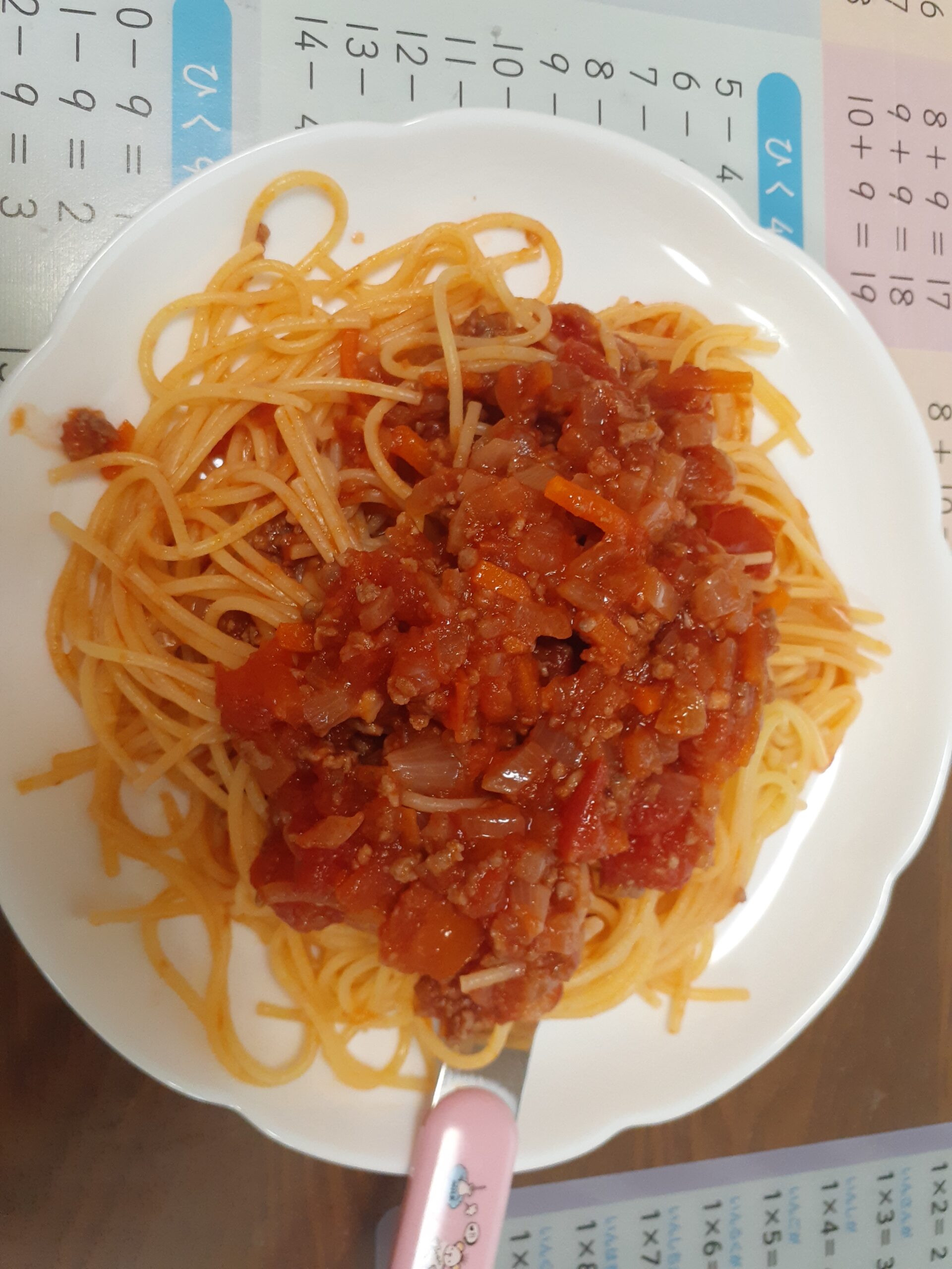 材料:たまねぎ1個、人参1/4、アイミンチ200g、トマトの缶詰1、パスタ2束