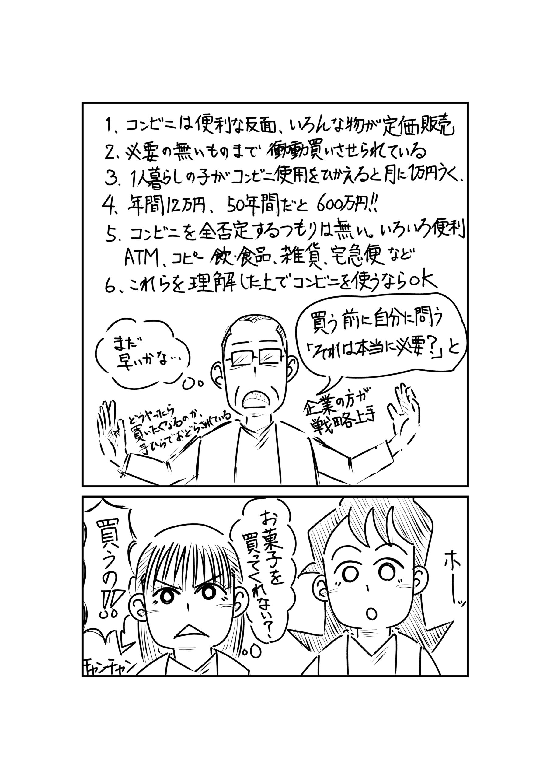 大人になっても、コンビニで買い揃えることになれば、人生でえられた収入の大半をコンビニに費やしていることになります。